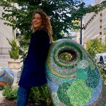My work consists of sculptures, installations, and murals. I primarily use mosaic glass medium to articulate the energy I am wanting to translate into the physical form. Mosaic is a static medium which I attempt to make feel flowing and soft. This tension is always present in my work and color and line are extremely important to depict this in my visual language.